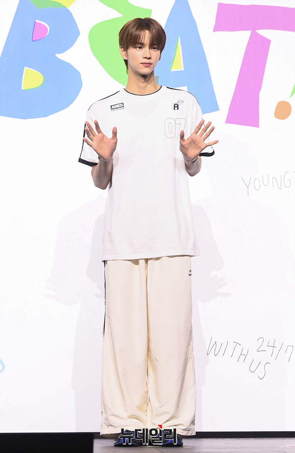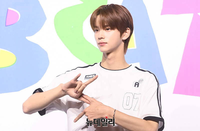 그룹 '투어스(TWS)' 신유가 24일 오후 서울 용산구 블루스퀘어에서 열린 미니 2집 '서머 비트!(SUMMER BEAT!)' 발매 기념 쇼케이스에서 포즈를 취하고 있다.
