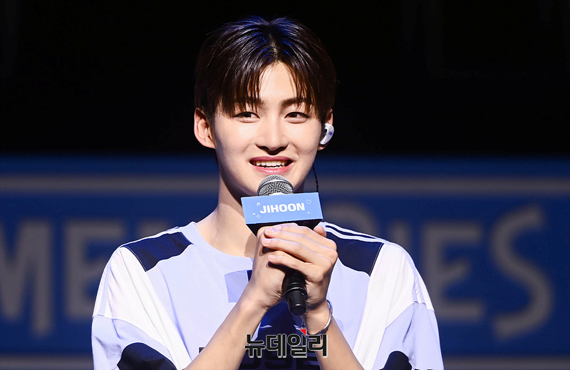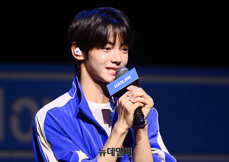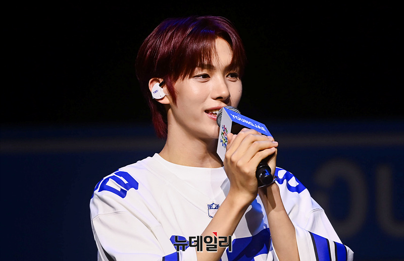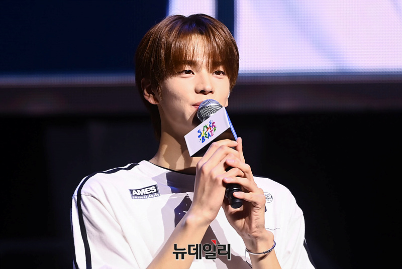 그룹 '투어스(TWS)' 영재, 지훈, 한진, 도훈, 경민, 신유가 24일 오후 서울 용산구 블루스퀘어에서 열린 미니 2집 '서머 비트!(SUMMER BEAT!)' 발매 기념 쇼케이스에서 소감을 밝히고 있다.