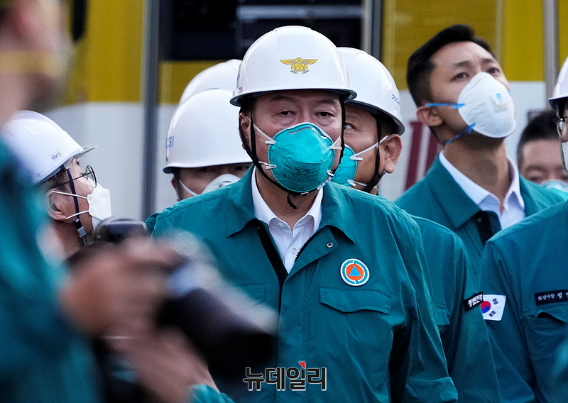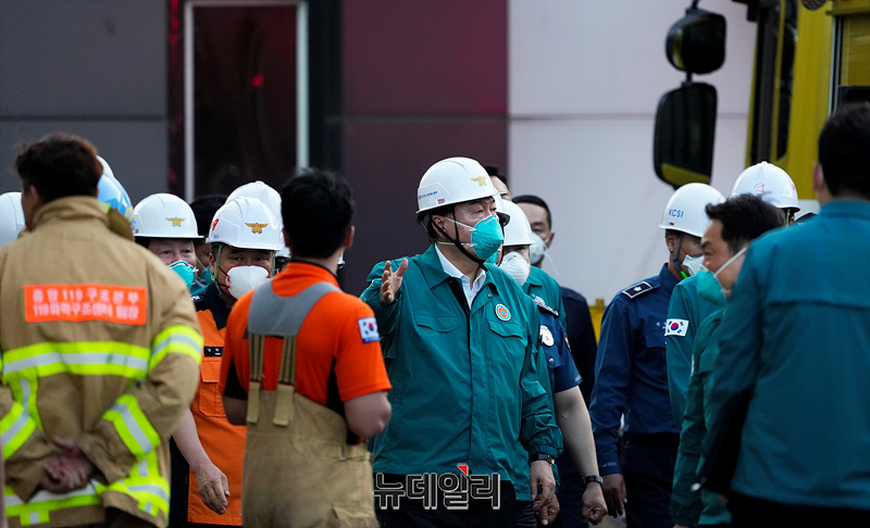 윤석열 대통령이 24일 오후 경기 화성시 전곡산업단지 내 일차전지 제조공장 화재 현장을 찾아 상황 점검을 하고 있다.