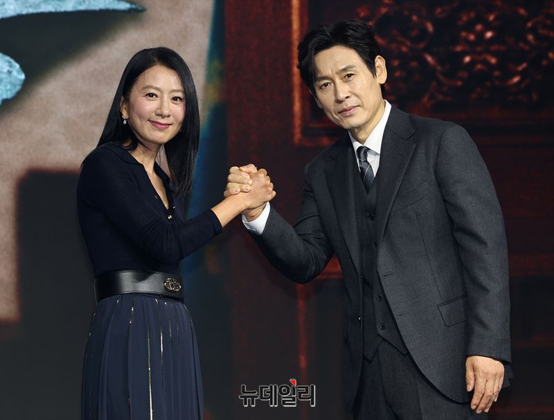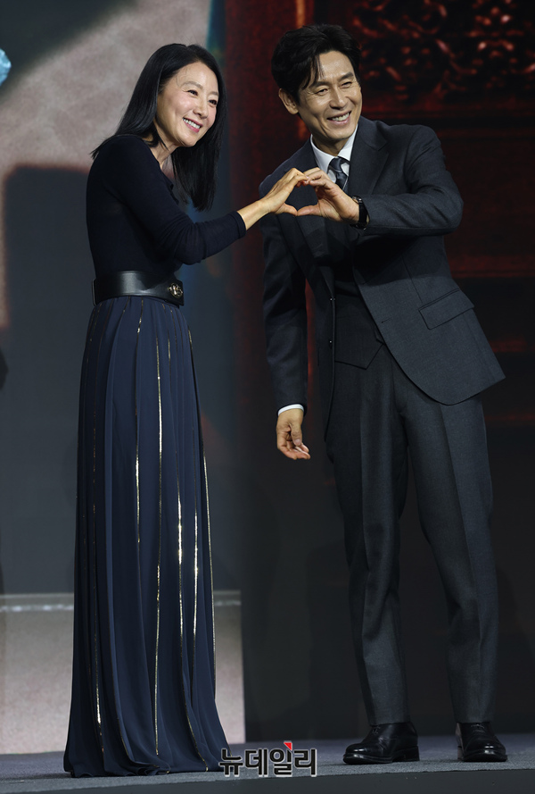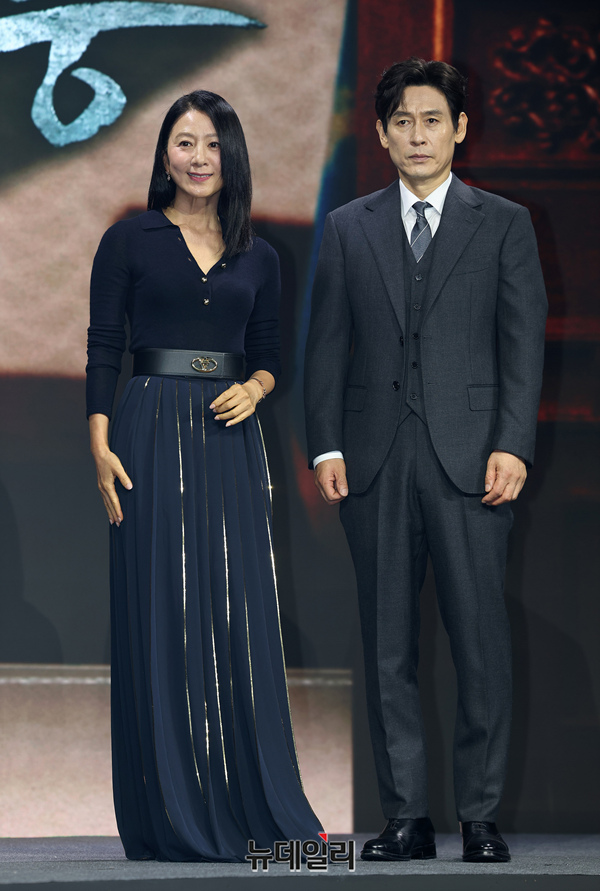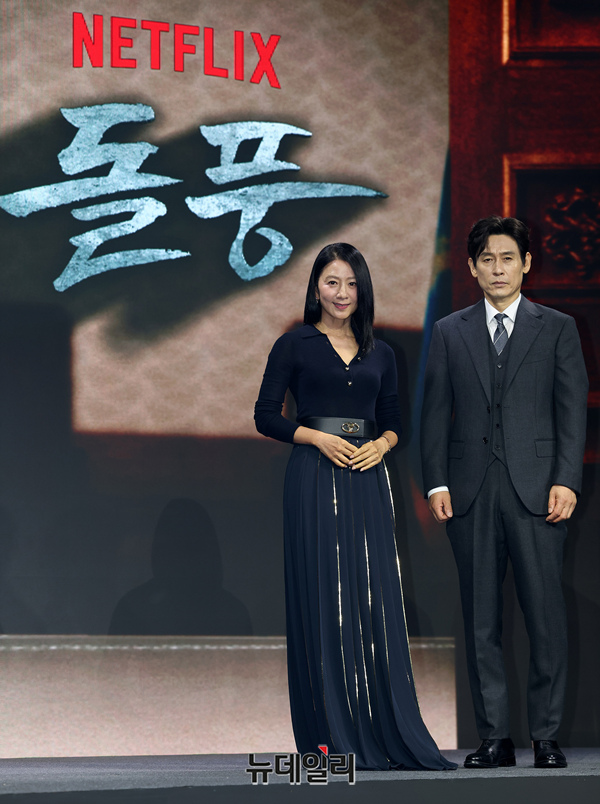 배우 김희애,설경구가 25일 오전 서울 종로구 JW 메리어트 동대문 스퀘어에서 열린 넷플릭스 시리즈 '돌풍(연출 김용완, 극본 박경수)' 제작보고회에서 포즈를 취하고 있다.