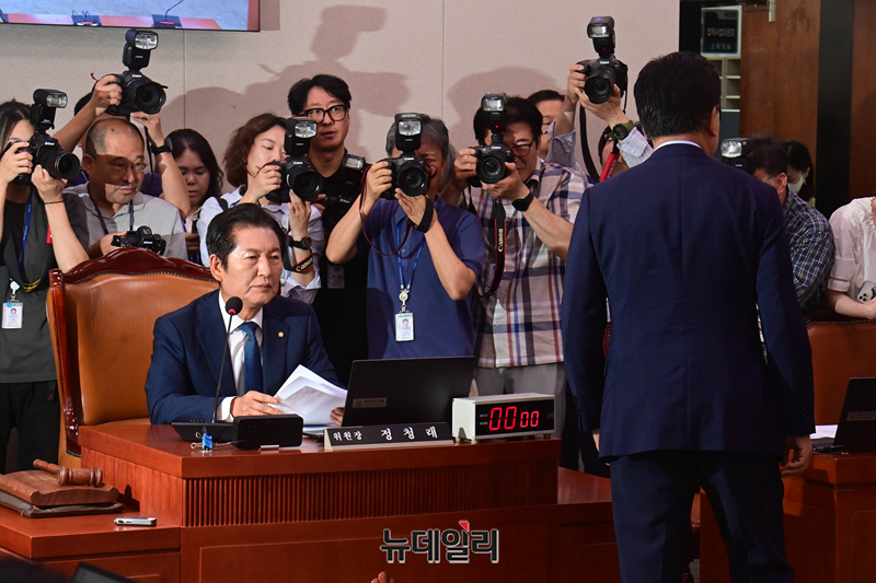유상범, 송석준 국민의힘 의원이 25일 오전 국회에서 열린 법제사법위원회 4차 전체회의에서 정청래 위원장과 더불어민주당 의원들을 향해 간사 선임부터 해야 한다며 의사일정 진행 관련 항의를 하고 있다.