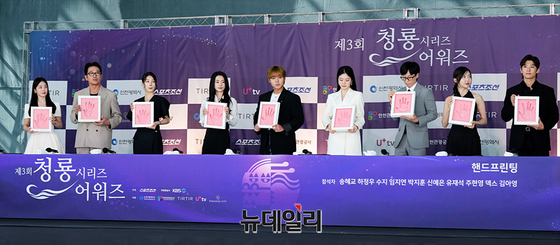 배우 송혜교, 하정우, 수지, 임지연, 박지훈, 신예은, 방송인 유재석, 배우 주현영, 덱스, 김아영이 25일 오후 인천 중구 상상플랫폼에서 열린 제3회 청룡시리즈어워즈 핸드프린팅 행사에서 포즈를 취하고 있다. (인천=서성진 기자)