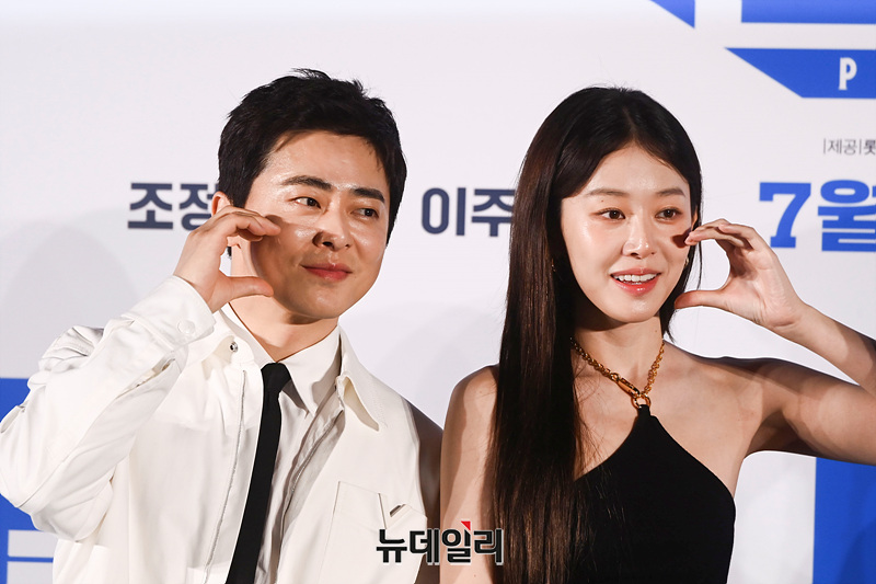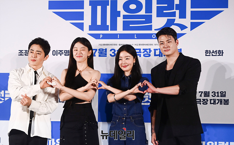 김한결 감독, 배우 조정석, 이주명, 한선화, 신승호가 26일 오전 서울 광진구 롯데시네마 건대입구점에서 열린 영화 '파일럿(감독 김한결)' 제작보고회에서 포즈를 취하고 있다.