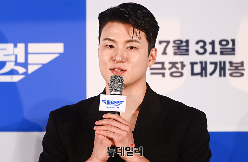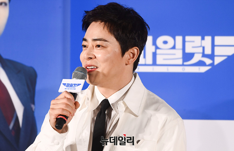 배우 조정석, 이주명, 한선화, 신승호, 김한결 감독이 26일 오전 서울 광진구 롯데시네마 건대입구점에서 열린 영화 '파일럿(감독 김한결)' 제작보고회에서 취재진의 질문에 답하고 있다.