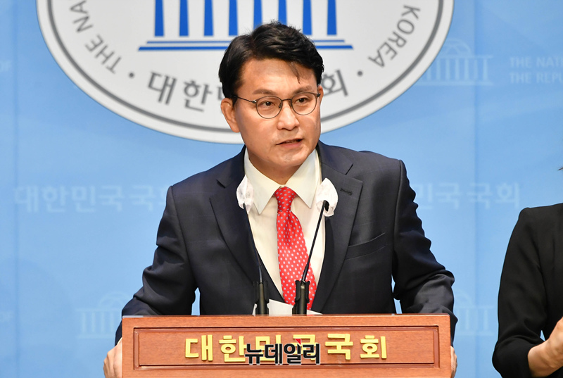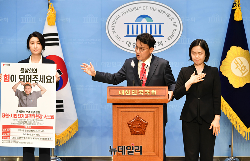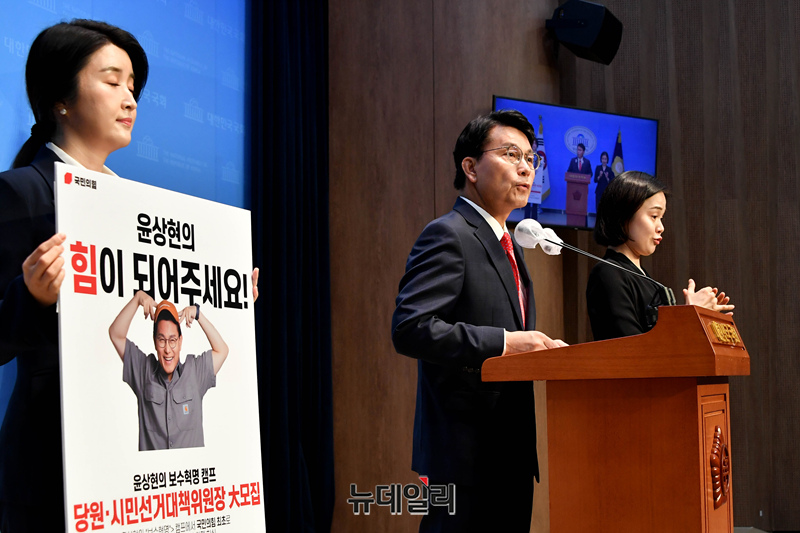 국민의힘 당 대표 출마 선언을 한 윤상현 의원이 26일 오전 소통관에서 현안 관련 기자회견을 하고 있다. 이날 윤 의원은 당원·시민선거대책위원장을 공모한다고 밝혔다.