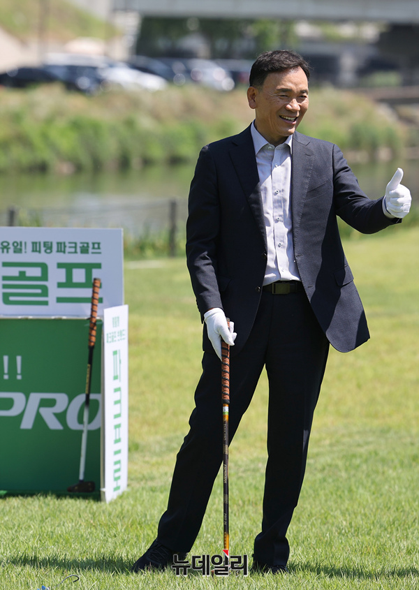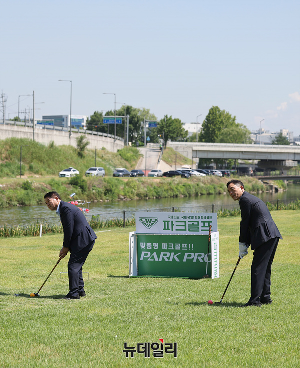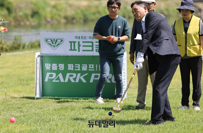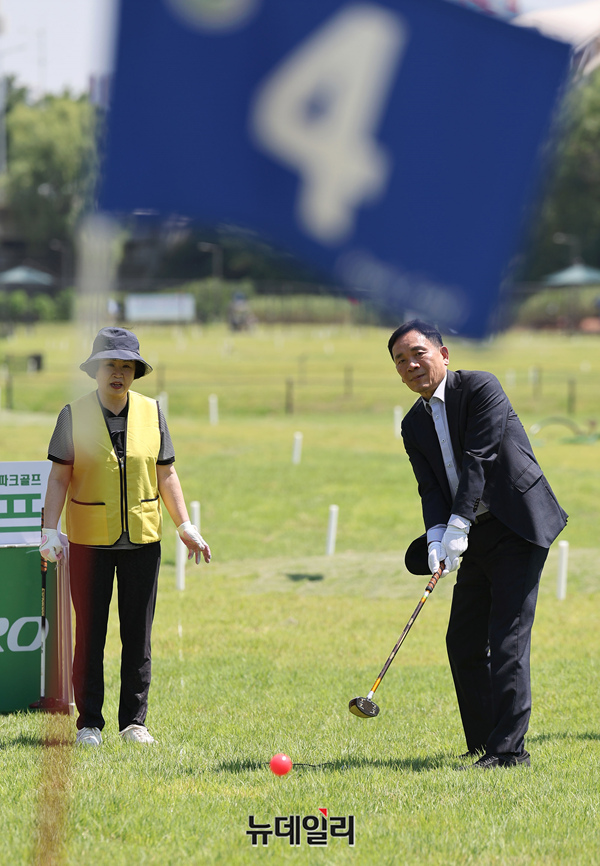 조성명 강남구청장이 26일 오전 서울 강남구 세곡동 탄천파크골프장에서 열린 준공식 직후 시타를 하고 있다.이날 준공한 강남탄천 파크골프장은 규모 2만4,552㎡의 27홀로 현재 서울에 있는 파크골프장 11곳 가운데 가장 크다.A, B, C 3개 코스 각 9개 홀로 구성됐다. A코스는 세곡동 1-3, 2-5번지(대곡교 인근) 일대 7,309.5㎡ △B코스는 세곡동 507번지(대곡교 탄천 우안) 일대 8,034.8㎡ △C코스는 세곡동 13-4번지 일대(강남힐링텃밭 인근) 9,207.3㎡ 규모로 각각 조성됐다.파크골프장은 7~8월 시범운영을 거쳐 9월부터 정식 운영할 예정이다.