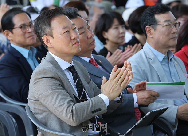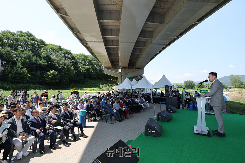 박수민(강남을) 국민의힘 의원이 26일 오전 서울 강남구 세곡동 탄천파크골프장에서 열린 준공식에서 인사말을 하고 있다.이날 준공한 강남탄천 파크골프장은 규모 2만4,552㎡의 27홀로 현재 서울에 있는 파크골프장 11곳 가운데 가장 크다.A, B, C 3개 코스 각 9개 홀로 구성됐다. A코스는 세곡동 1-3, 2-5번지(대곡교 인근) 일대 7,309.5㎡ △B코스는 세곡동 507번지(대곡교 탄천 우안) 일대 8,034.8㎡ △C코스는 세곡동 13-4번지 일대(강남힐링텃밭 인근) 9,207.3㎡ 규모로 각각 조성됐다.파크골프장은 7~8월 시범운영을 거쳐 9월부터 정식 운영할 예정이다.