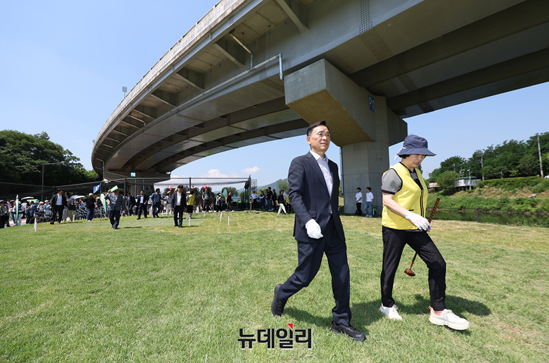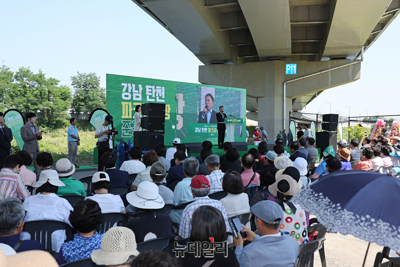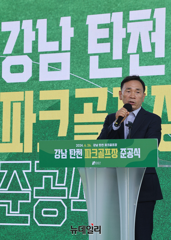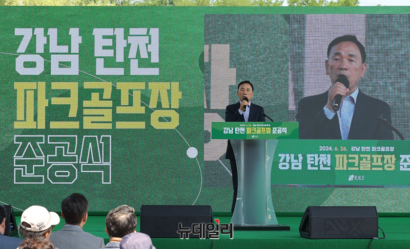 조성명 강남구청장이 26일 오전 서울 강남구 세곡동 탄천파크골프장에서 열린 준공식에서 인사말을 하고 있다.이날 준공한 강남탄천 파크골프장은 규모 2만4,552㎡의 27홀로 현재 서울에 있는 파크골프장 11곳 가운데 가장 크다.A, B, C 3개 코스 각 9개 홀로 구성됐다. A코스는 세곡동 1-3, 2-5번지(대곡교 인근) 일대 7,309.5㎡ △B코스는 세곡동 507번지(대곡교 탄천 우안) 일대 8,034.8㎡ △C코스는 세곡동 13-4번지 일대(강남힐링텃밭 인근) 9,207.3㎡ 규모로 각각 조성됐다.파크골프장은 7~8월 시범운영을 거쳐 9월부터 정식 운영할 예정이다.