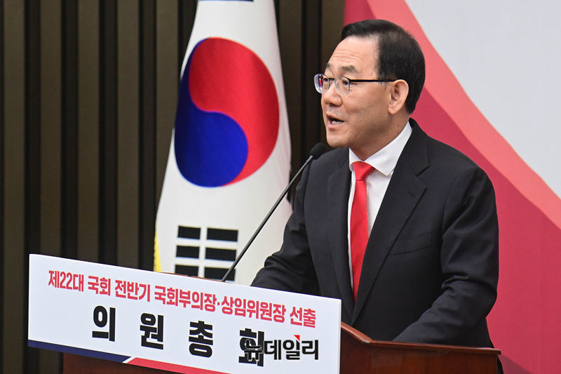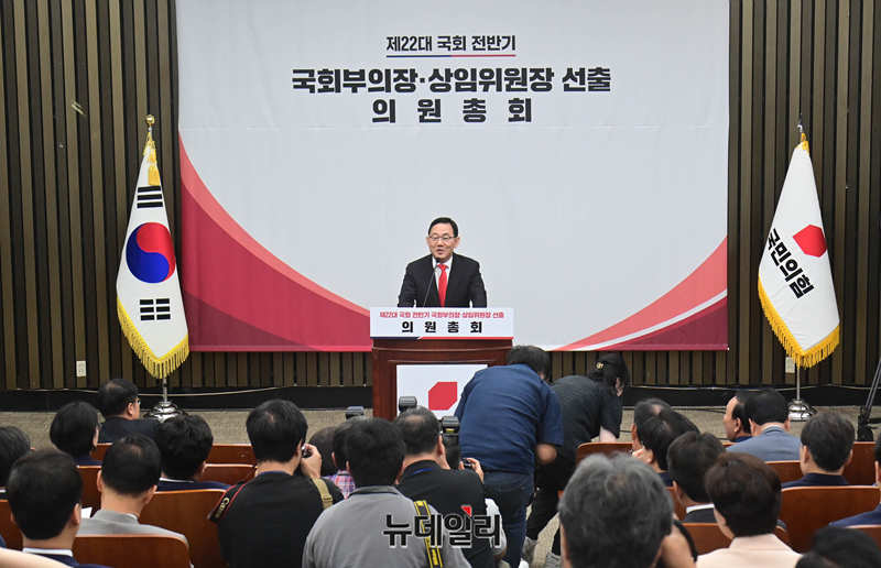 국회 전반기 국회부의장 후보자로 선출된 국민의힘 주호영 의원이 27일 오전 국회에서 열린 제22대 국회 전반기 당 국회부의장·상임위원장 후보자 선출 의원총회에서 당선 인사를 하고 있다.