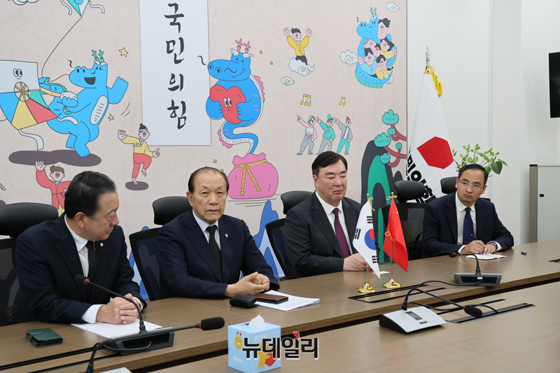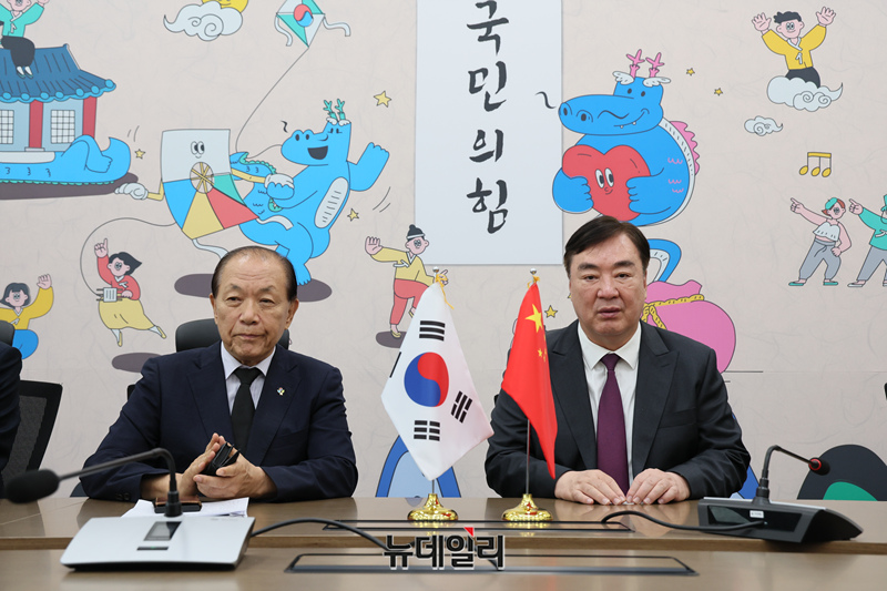 황우여(왼쪽) 국민의힘 비상대책위원장과 싱하이밍 중국 주한대사가 27일 오전 국회에서 만나 경기 화성 아리셀 공장 화재사고와 관련해 대응 방안을 논의했다. (사진=국민의힘)