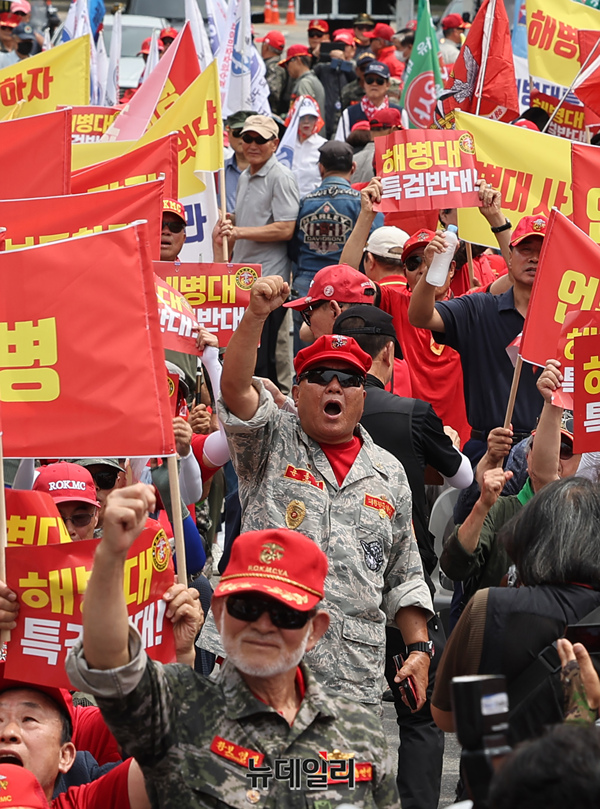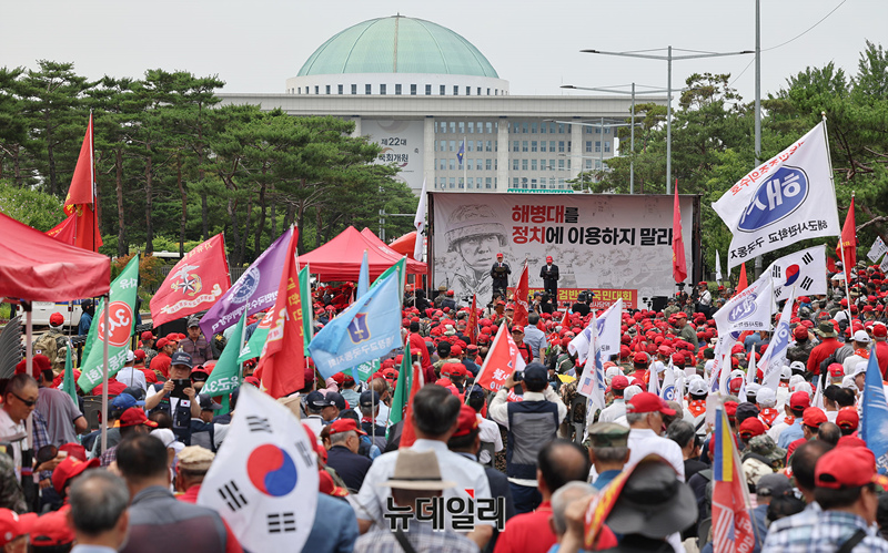 해병대예비역 단체가 27일 오후 서울 여의도 국회의사당 앞에서 "해병대를 정치에 이용하지 말라"며 총궐기대회를 진행하고 있다.