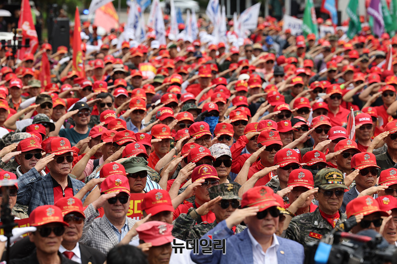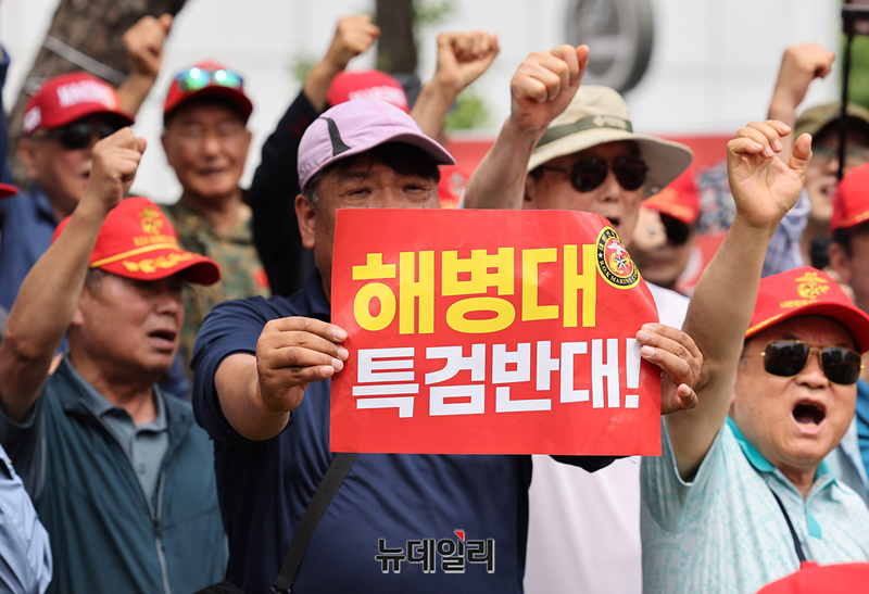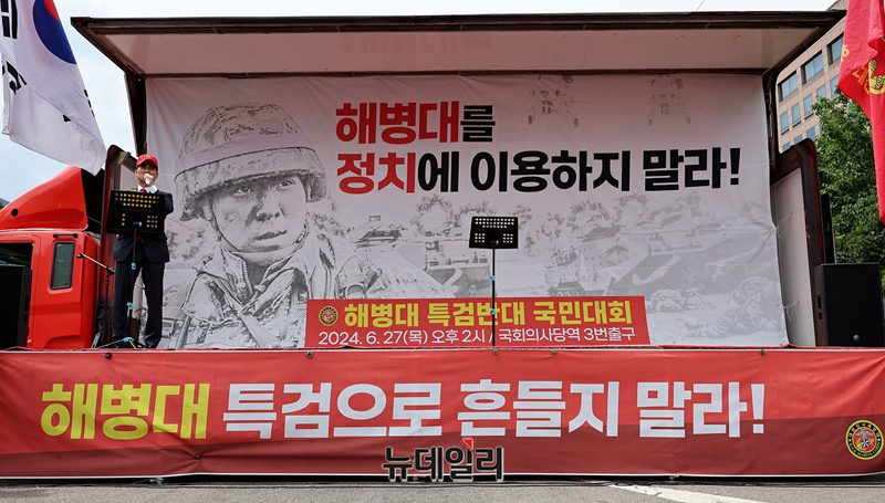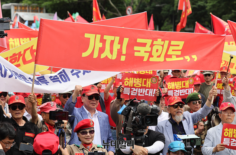 해병대예비역 단체가 27일 오후 서울 여의도 국회의사당 앞에서 해병대 특검 반대 총궐기대회를 열고 "해병대를 정치에 이용하지 말라"고 주장했다.