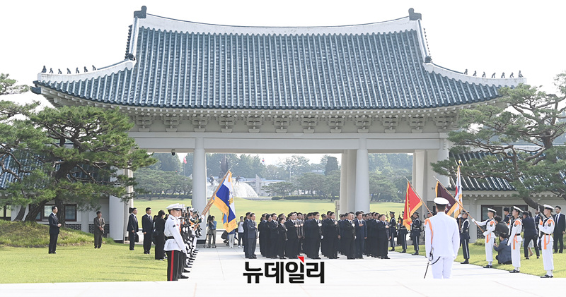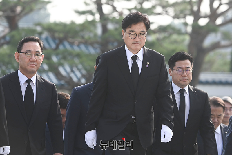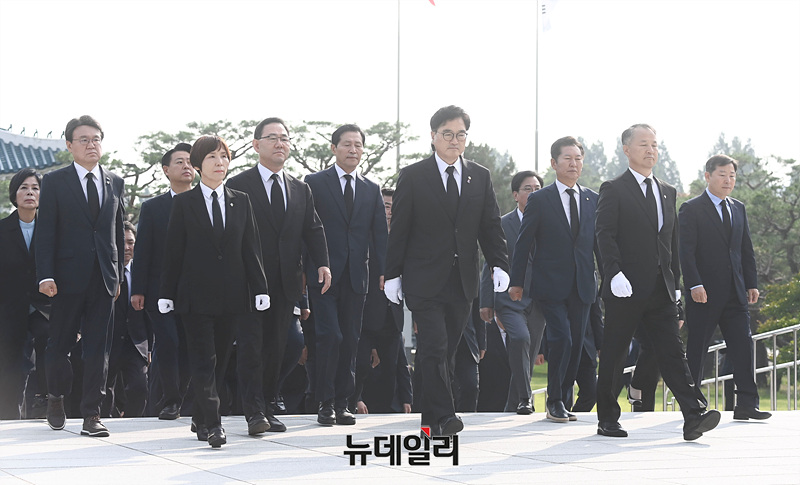 우원식 국회의장, 주호영 국회부의장, 정당 원내대표, 상임위원장단 등 참석자들이 28일 오전 서울 동작구 국립서울현충원을 찾아 참배하기 위해 이동하고 있다.