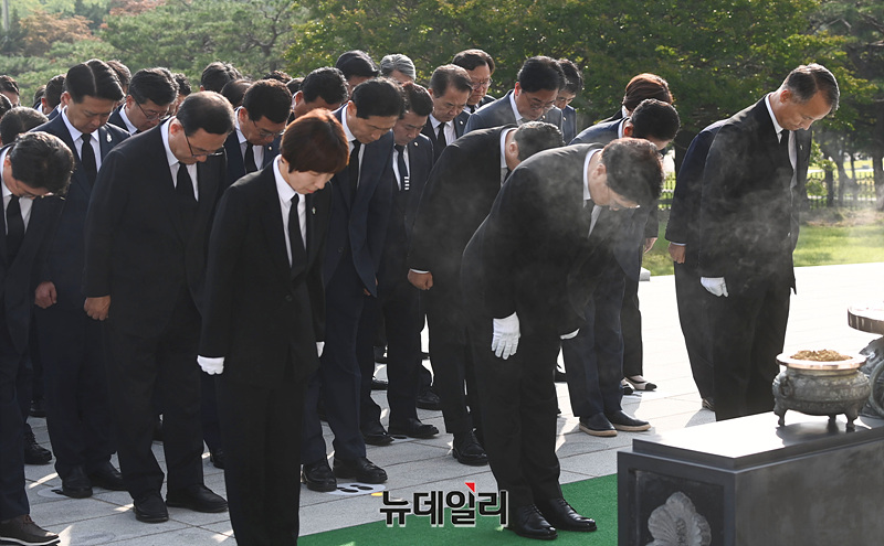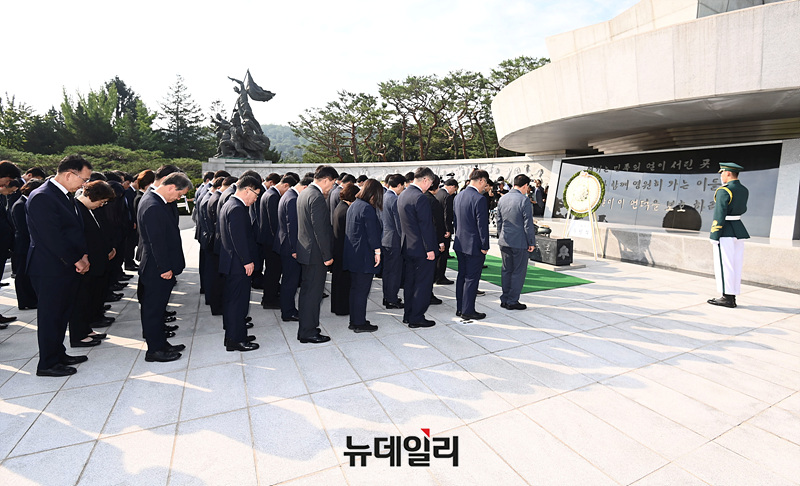 우원식 국회의장, 주호영 국회부의장, 정당 원내대표, 상임위원장단 등 참석자들이 28일 오전 서울 동작구 국립서울현충원을 찾아 참배하고 있다.