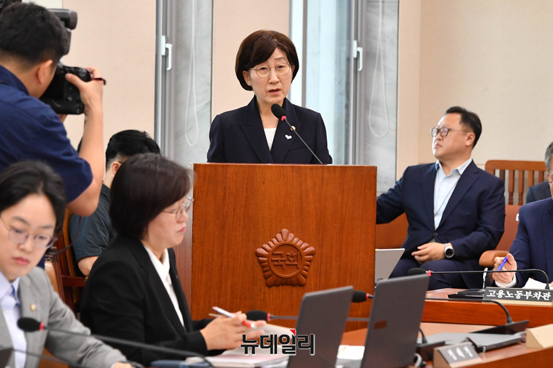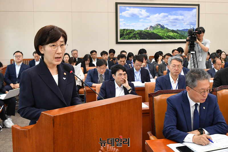 한화진 환경부장관이 28일 오전 국회에서 열린 환경노동위원회 전체회의에서 화성 배터리제조공장 화재 사고 관련 현안보고를 하고 있다.