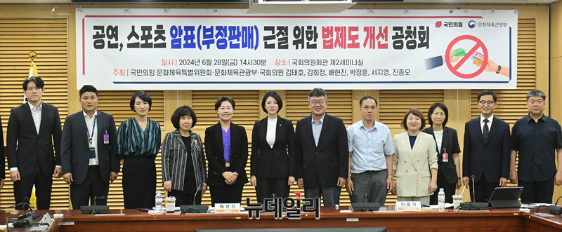 '공연, 스포츠 분야 암표 근절을 위한 법·제도 개선 공청회'가 28일 오후 국회 의원회관에서 열린 가운데 참석자들이 기념 촬영을 하고 있다.