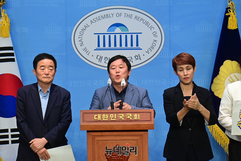 안진걸 민생경제연구소장·강득구 더불어민주당 의원이 28일 오후 국회 소통관에서 열린 '서울양평고속도로 조작 사건 등 공익제보 및 문제제기 1년 맞이 국회의원-양평주민-시민사회 공동 기자회견'에서 발언을 하고 있다.