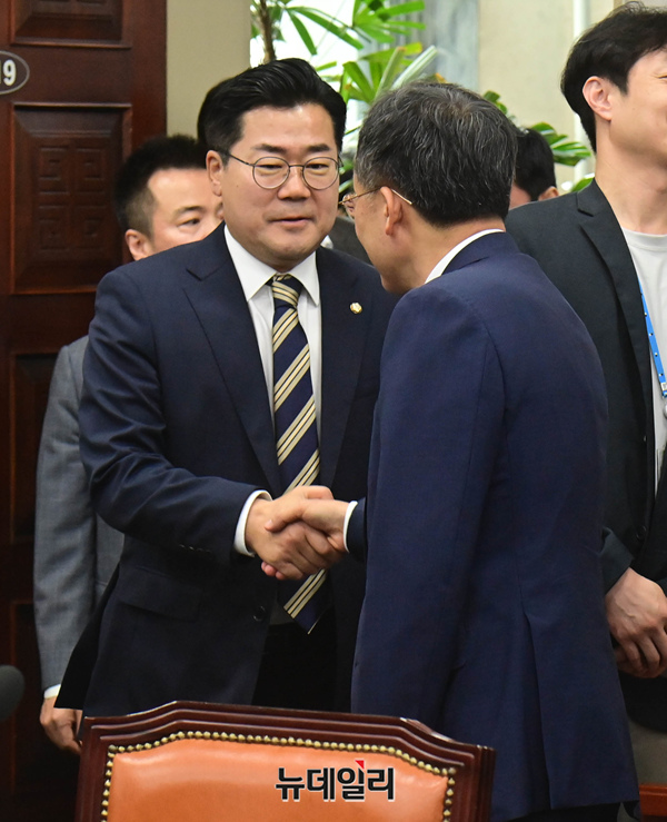 추경호 국민의힘 원내대표가 1일 오전 국회에서 열린 운영위 전체회의에 참석해 박찬대 더불어민주당 원내대표와 악수를 나누고 있다.
