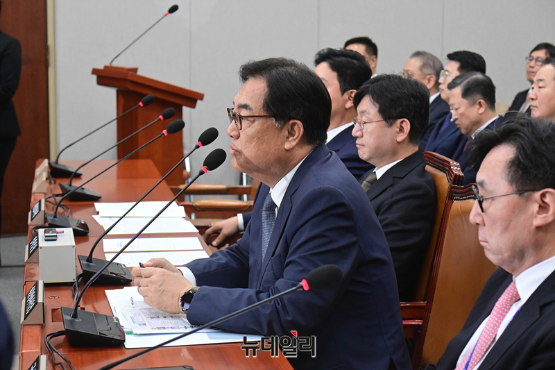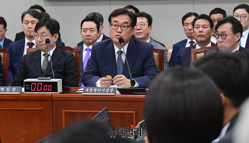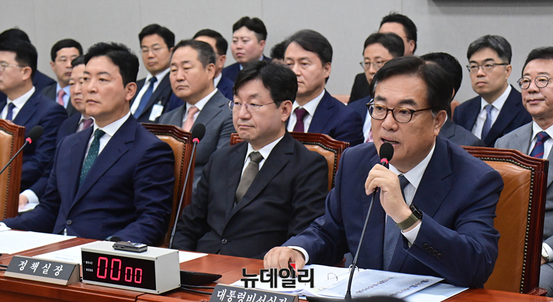정진석 대통령 비서실장이 1일 오전 국회에서 열린 운영위원회 전체회의에서 의원들의 질문에 답하고 있다.
