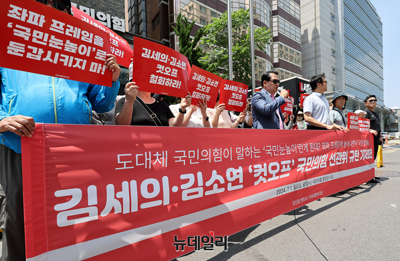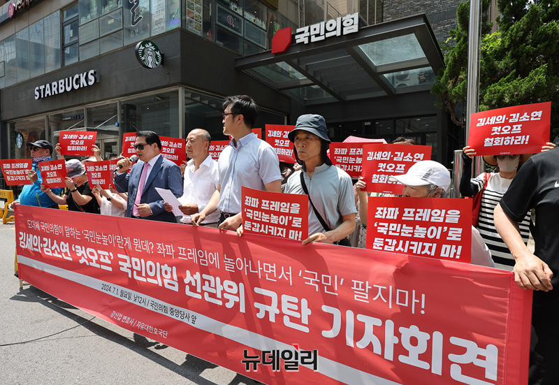 강신업 변호사가 자유대한호국단 함께 1일 정오 서울 여의도 국민의힘 당사 앞에서 김세의, 김소연 전당대회 컷오프에 반발해 국민의힘 선관위를 규탄하는 기자회견을 갖고 있다.이들은 "국민의힘 지지자들이 얌전한 선비를 원하는 게 아니다"며 "대한민국의 법치, 자유민주주의, 보수의 가치를 지키기 위해 처절하게 싸워줄 투사를 원하고 있다"고 말했다.이어 "김세의, 김소연 컷오프는 당원들의 선택권을 빼앗은 명백한 월권"이라며 이들에게 기회를 줘 당원들이 스스로 선택하도록 해야된다"고 말했다.앞서 김세의 가로세로연구소 대표와 김소연 변호사는 국민의힘 최고위원과 청년최고위원에 각각 출사표를 냈지만 컷오프 됐다.국민의힘 전당대회는 7월 8일 광주 김대중컨벤션센터를 시작으로 전국에서 합동연설회를 개최 할 예정이다.