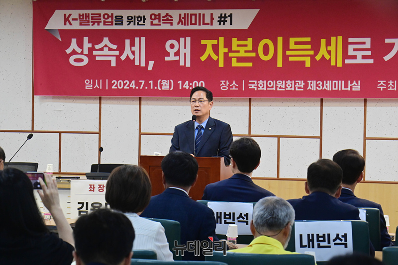 박수영 국민의힘 의원이 1일 오후 국회 의원회관에서 열린 '상속세, 왜 자본이득세로 가야 하나' 세미나에서 환영사를 하고 있다.