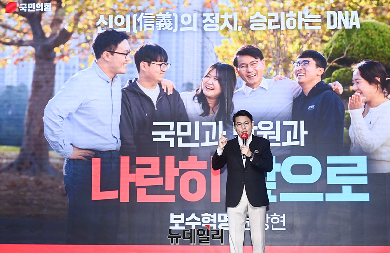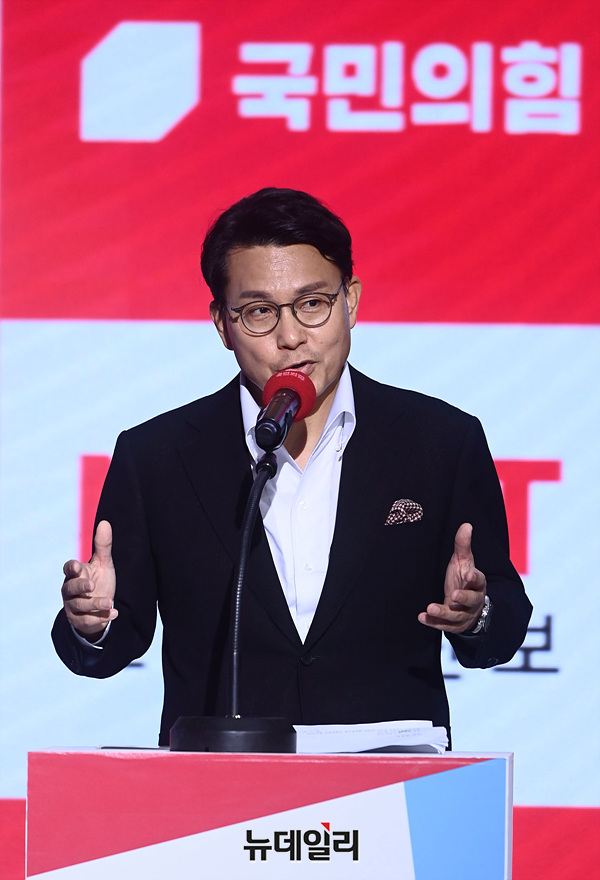 윤상현 국민의힘 당대표 후보가 2일 오전 서울 강서구 ASSA아트홀에서 열린 '체인지 5분 비전발표회'에서 비전발표를 하고 있다.