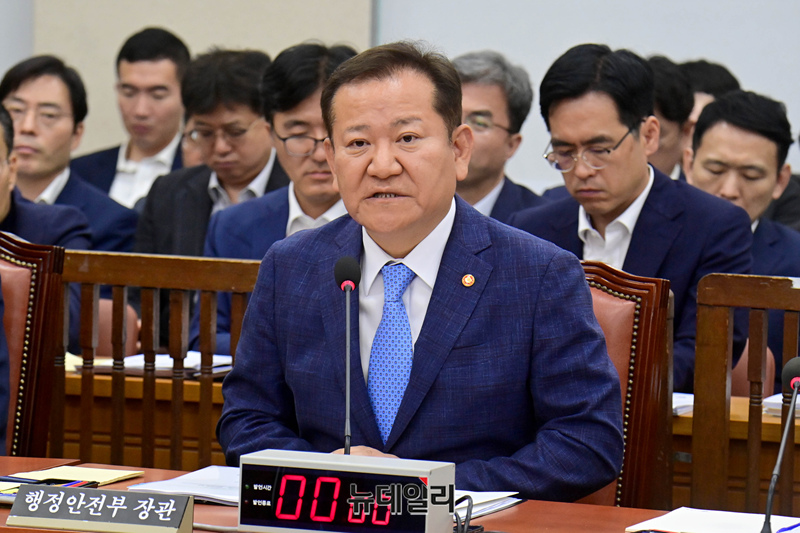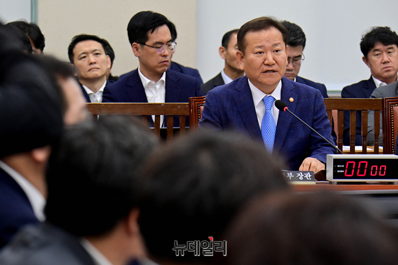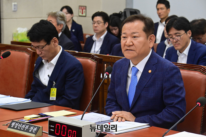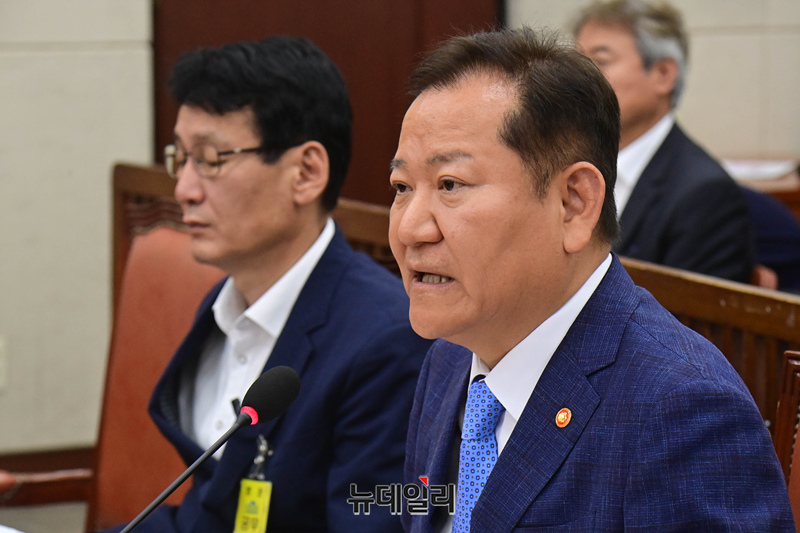 이상민 행정안전부 장관이 2일 오전 국회에서 열린 행정안전위원회 전체회의에서 의원들의 질문에 답하고 있다.