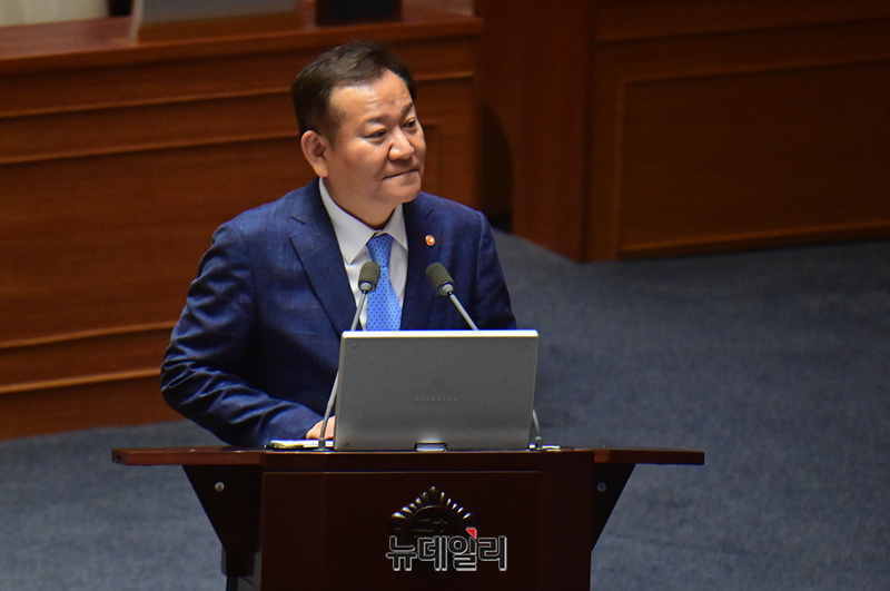 이상민 행정안전부 장관이 2일 오후 국회 본회의 대정부질문에서 의원들의 질문에 답하고 있다.