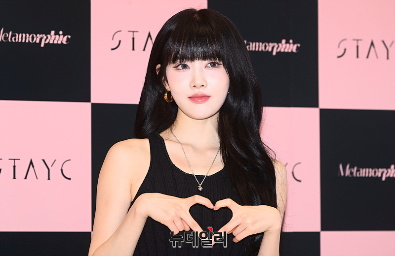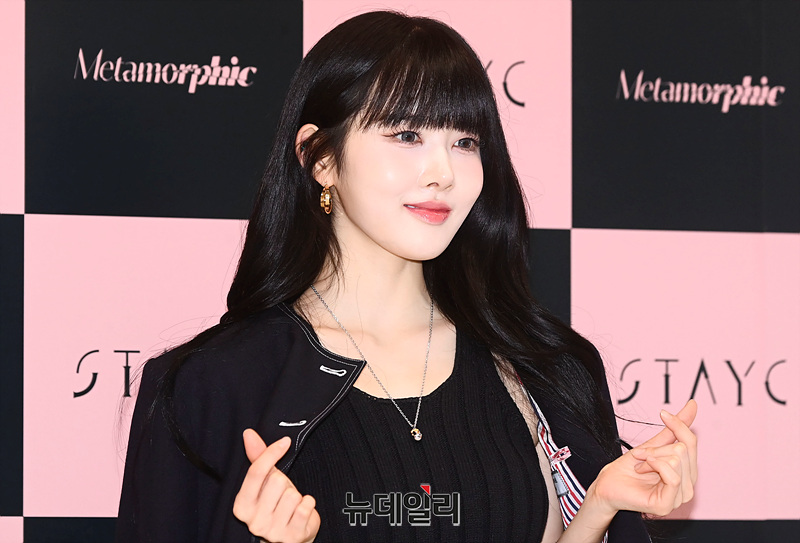 걸그룹 스테이씨 시은이 2일 오후 서울 성동구 카페 쎈느(Scene)에서 열린 정규 1집 '메타모르픽(Metamorphic)' 발매 기념 팝업 스페이스에서 포즈를 취하고 있다.