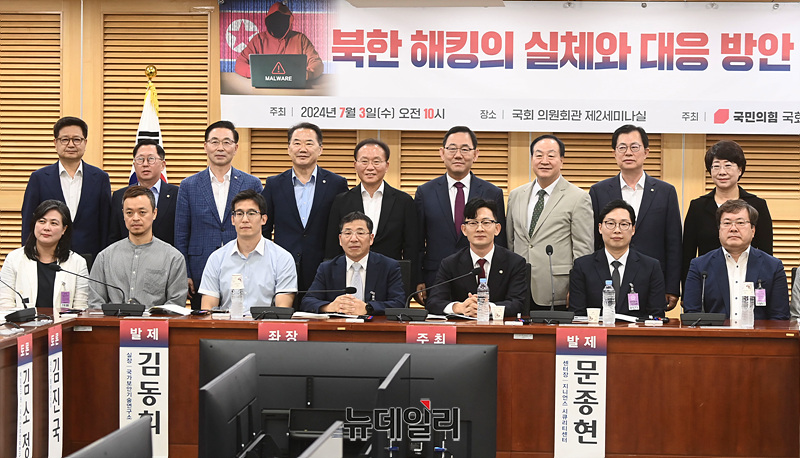 박충권, 신성범, 윤재옥, 한기호 국민의힘 의원과 주호영 국회부의장을 포함한 참석자들이 3일 오전 서울 여의도 국회 의원회관에서 열린 '북한 해킹의 실체와 대응 방안 세미나'에서 기념촬영을 하고 있다.