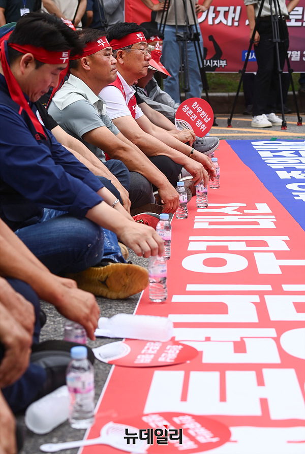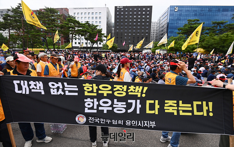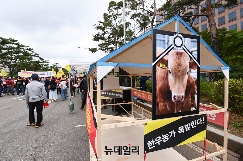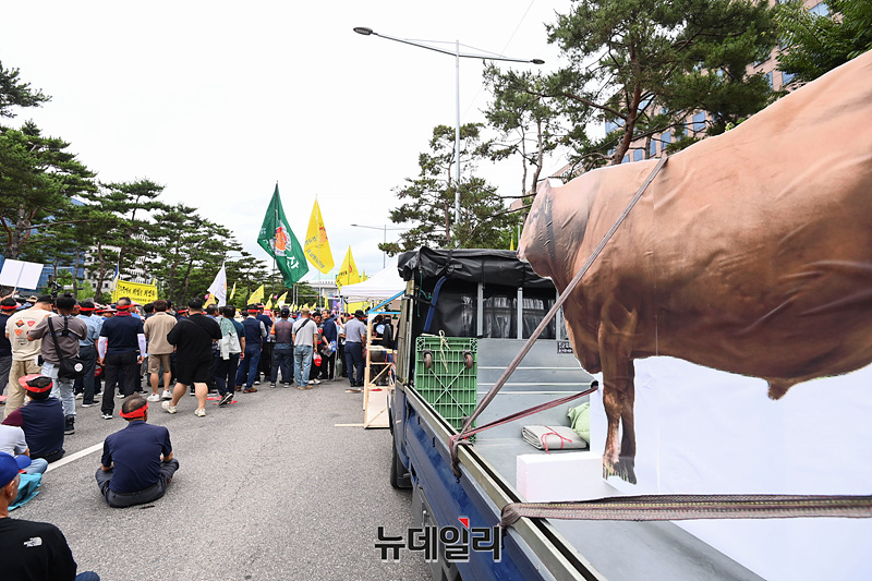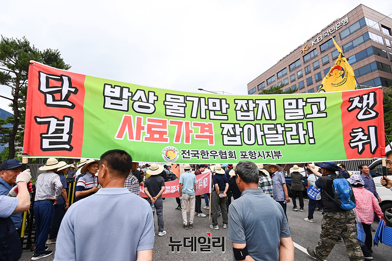 이들은 "밥상 물가만 잡지 말고 사료가격 잡아달라" "키울수록 손해나는 한우사업 지원하라" "농식품부는 한우산업 안정대책 즉각 마련하라" "폐업속출 한우산업! 최저생산비 보장하라!" 등의 문구가 적힌 플랜카드를 들고 한우산업에 대한 대책 마련을 촉구했다.