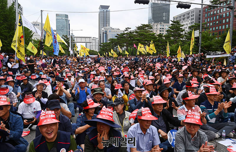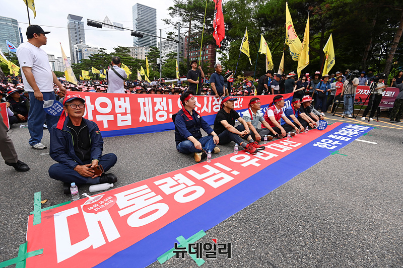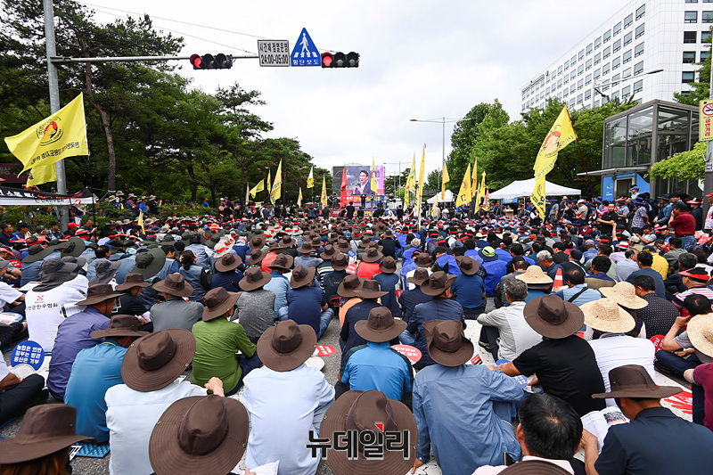 전국한우협회 소속 회원들이 3일 오후 서울 여의도 국회의사당역 앞에서 열린 '전국 한우농가 한우산업 안정화 촉구 한우 반납 투쟁'에서 한우법 제정을 촉구하고 있다.
