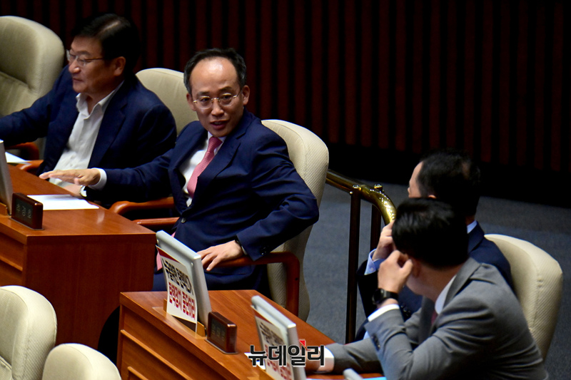 추경호 국민의힘 원내대표가 3일 오후 국회에서 열린 본회의에서 의원들과 대화를 나누고 있다.