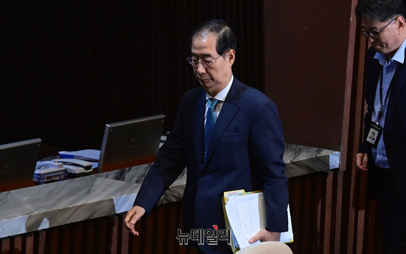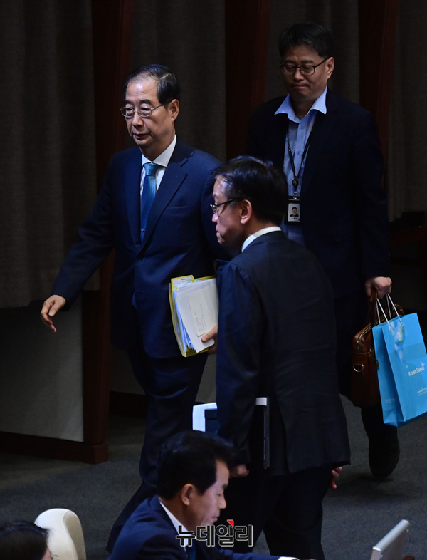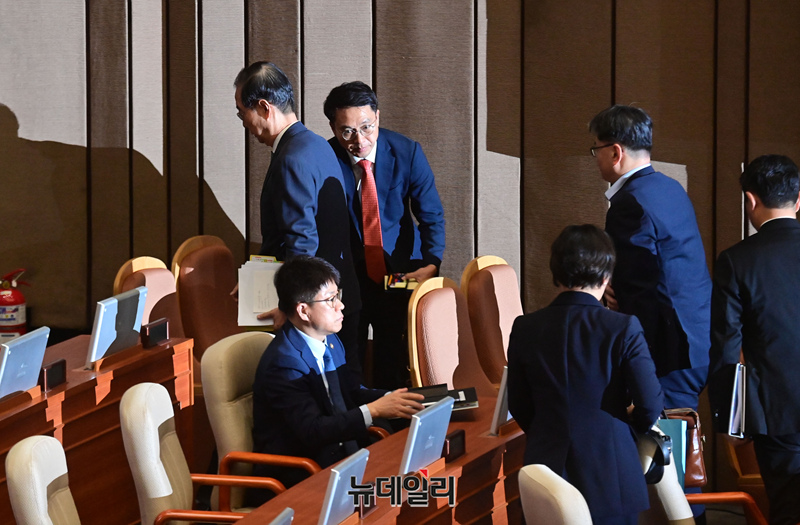 한덕수 국무총리와 최상목 경제부총리 겸 기획재정부 장관 등 국무위원들이 3일 오후 국회 본회의에서 '채상병특검법안' 무제한토론(필리버스터)으로 대정부질문이 파행되자 회의장을 떠나고 있다.
