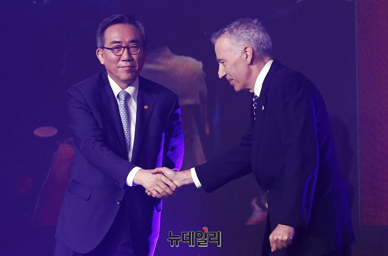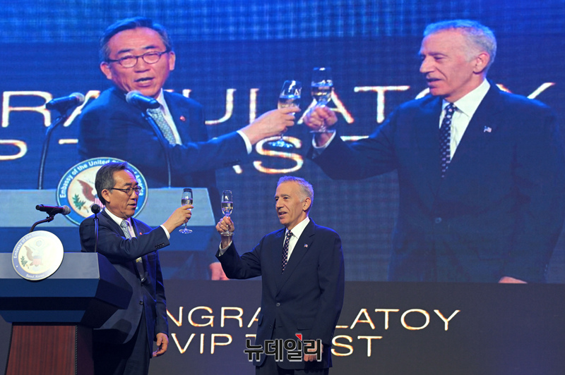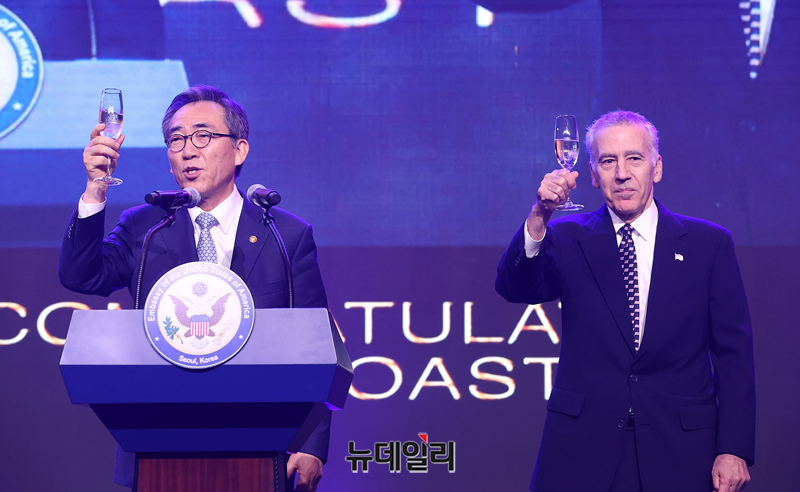 조태열 외교부 장관과 필립 골드버그 주한 미국대사가 3일 오후 서울 용산구 그랜드 하얏트 서울에서 열린 미국 독립기념일 행사에서 건배 제의를 하고 있다. (사진=공동취재단)