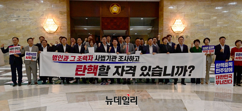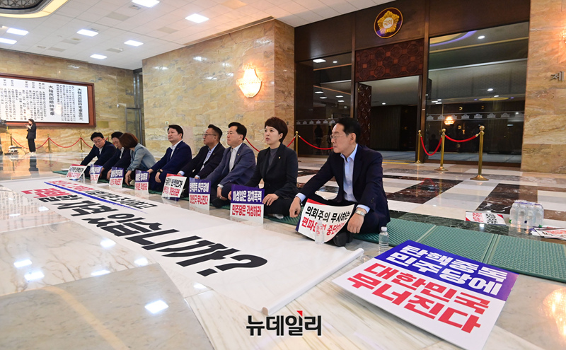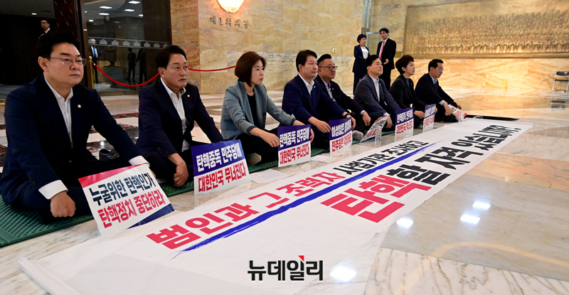 국민의힘 의원들이 4일 오전 '채상병특검법안' 무제한토론(필리버스터)이 진행되고 있는 국회 본회의장 앞 로텐더홀에서 더불어민주당의 탄핵 난발을 규탄하는 릴레이 농성을 하고 있다.