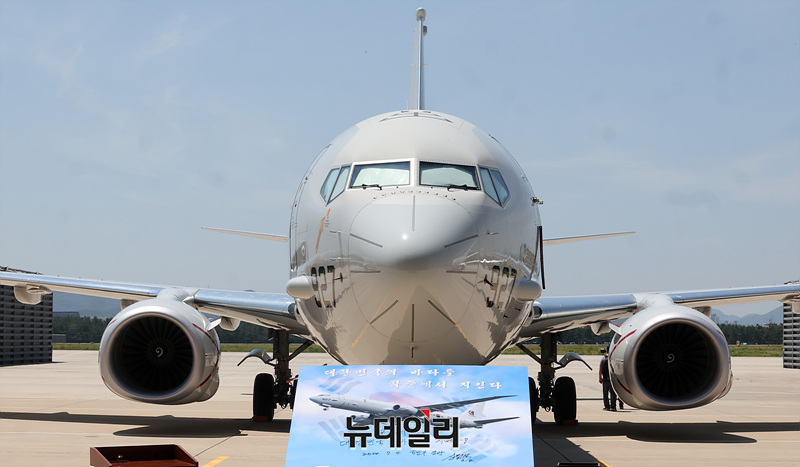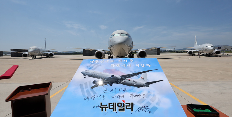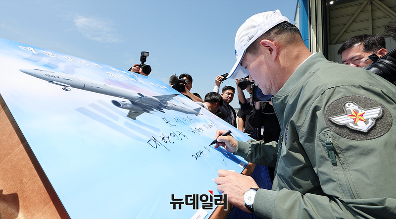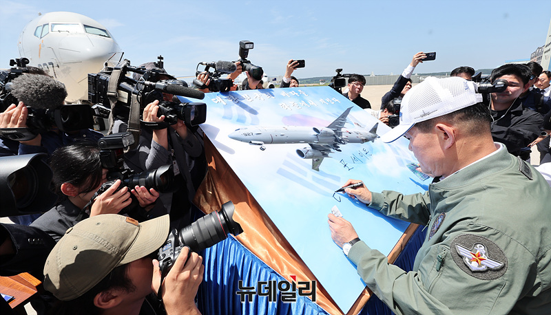 신원식 국방부 장관이 4일 오전 경북 포항시 해군항공사령부에서 열린 '해상초계기(P-8A) 국내 인수식'에서 비행 안전 기원 휘호식을 하고 있다. (사진=공동취재단)