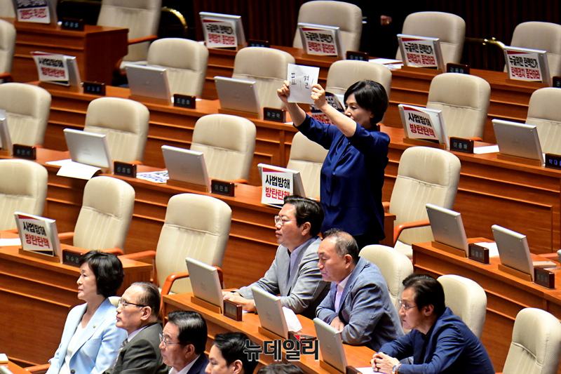 최민희 더불어민주당 의원이 4일 오후 국회에서 열린 본회의에서 순직 해병 수사 방해 및 사건 은폐 등의 진상규명을 위한 특별검사의 임명 등에 관한 법률안에 대한 필리버스터(무제한 토론)를 중단하는 투표를 하자며 피켓을 들고 있다.