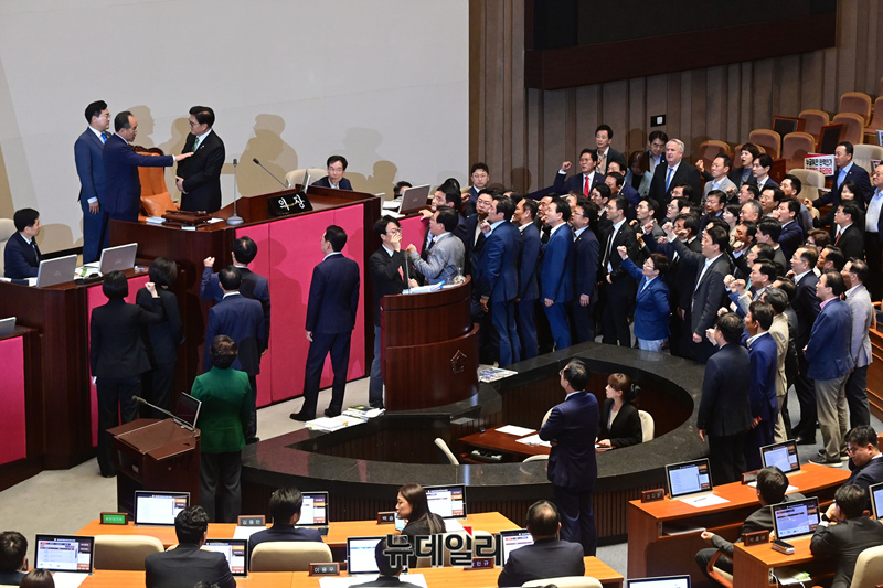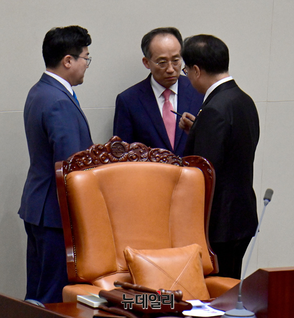 우원식 국회의장이 4일 오후 국회 본회의장에서 채상병 특검법 법안 처리 저지를 위한 무제한 토론(필리버스터)을 강제 종결하자 추경호 국민의힘 원내대표, 박찬대 더불어민주당 원내대표가 관련 논의를 하고 있다.