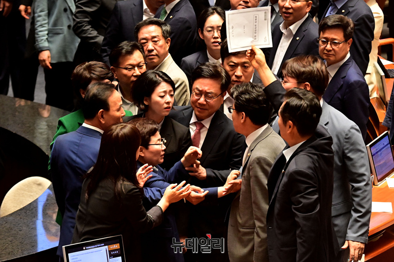 우원식 국회의장이 4일 오후 국회 본회의장에서 채상병 특검법 법안 처리 저지를 위한 무제한 토론(필리버스터)을 강제 종결하자 국민의힘 의원들이 항의하고 있는 가운데 배현진 국민의힘 의원과 진성준 더불어민당 의원이 언쟁을 벌이고 있다.