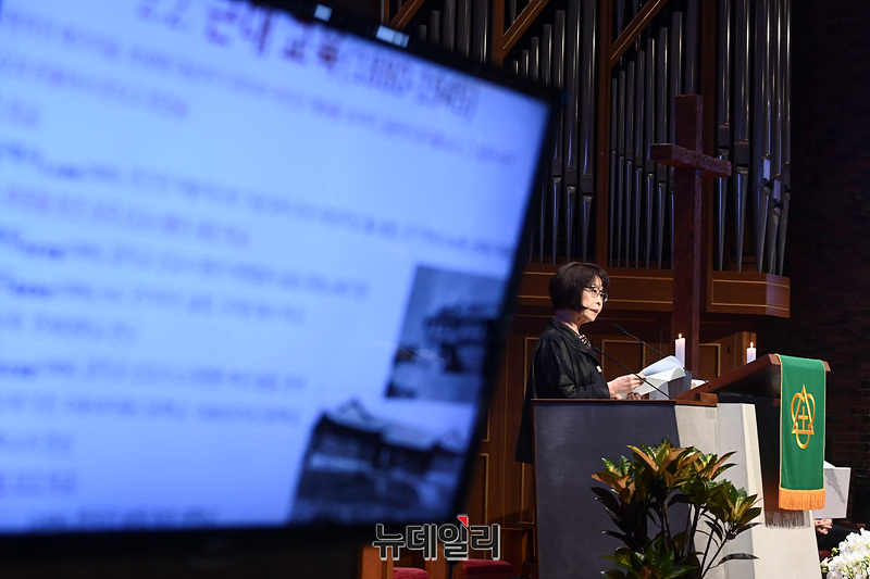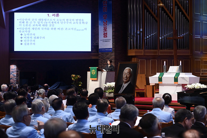 김영기 조지워싱턴대 명예교수가 5일 오후 서울 중구 정동교회에서 '이승만과 대한민국'을 주제로 열린 한미우남포럼에서 '교육대통령 이승만'을 발표하고 있다.이날 1부 행사는 최재형 트러스트포럼 대표의 개회선언을 시작으로 김남수 이승만건국대통령기념사업회 회장이 대회사를, 김영기 조지워싱턴대 명예교수, 데이빗 필즈 위스콘신대 교수, 오영섭 독립기념관 이사, 이택선 명지대 교수, 원성웅 목사가 발표에 나섰다.이어진 2부 행사는 김황식 이승만대통령 기념재단 이사장, 정운찬 상임고문대표, 김충환 해공신익희선생기념사업회 회장, 원로 연기자 최불암이 각각 축사했다.