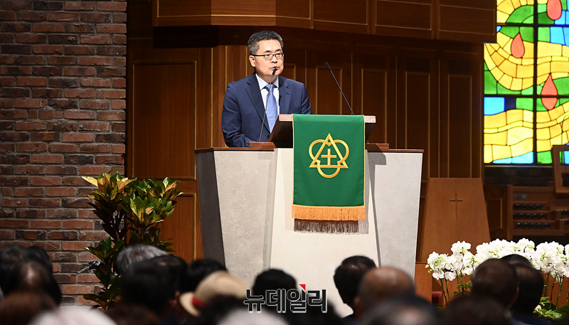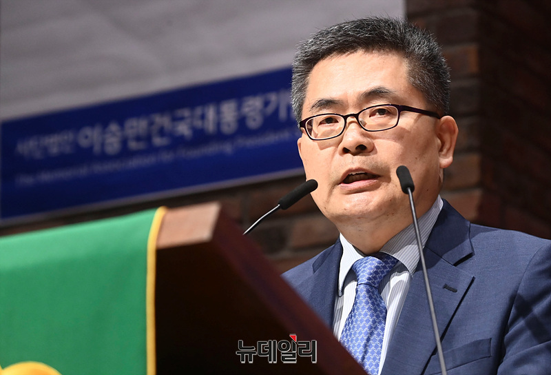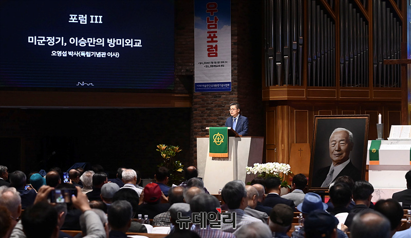 오영섭 독립기념관 이사가 5일 오후 서울 중구 정동교회에서 '이승만과 대한민국'을 주제로 열린 한미우남포럼에서 '미군정기, 이승만의 방미외교'를 발표하고 있다.이날 1부 행사는 최재형 트러스트포럼 대표의 개회선언을 시작으로 김남수 이승만건국대통령기념사업회 회장이 대회사를, 김영기 조지워싱턴대 명예교수, 데이빗 필즈 위스콘신대 교수, 오영섭 독립기념관 이사, 이택선 명지대 교수, 원성웅 목사가 발표에 나섰다.이어진 2부 행사는 김황식 이승만대통령 기념재단 이사장, 정운찬 상임고문대표, 김충환 해공신익희선생기념사업회 회장, 원로 연기자 최불암이 각각 축사했다.