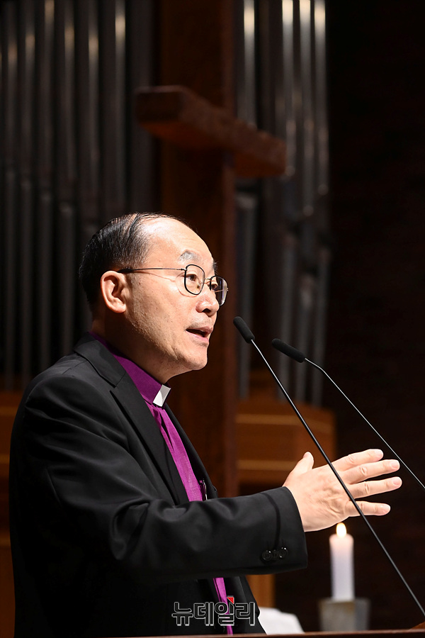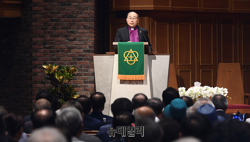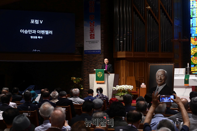 원성웅 목사가 5일 오후 서울 중구 정동교회에서 '이승만과 대한민국'을 주제로 열린 한미우남포럼에서 '이승만과 아펜젤러'를 발표하고 있다.이날 1부 행사는 최재형 트러스트포럼 대표의 개회선언을 시작으로 김남수 이승만건국대통령기념사업회 회장이 대회사를, 김영기 조지워싱턴대 명예교수, 데이빗 필즈 위스콘신대 교수, 오영섭 독립기념관 이사, 이택선 명지대 교수, 원성웅 목사가 발표에 나섰다.이어진 2부 행사는 김황식 이승만대통령 기념재단 이사장, 정운찬 상임고문대표, 김충환 해공신익희선생기념사업회 회장, 원로 연기자 최불암이 각각 축사했다.