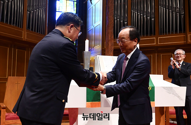 김남수 이승만건국대통령기념사업회 회장이 5일 오후 서울 중구 정동교회에서 '이승만과 대한민국'을 주제로 열린 한미우남포럼에서 서월석 경정에게 이승만 라인상을 수여하고 있다.이날 1부 행사는 최재형 트러스트포럼 대표의 개회선언을 시작으로 김남수 이승만건국대통령기념사업회 회장이 대회사를, 김영기 조지워싱턴대 명예교수, 데이빗 필즈 위스콘신대 교수, 오영섭 독립기념관 이사, 이택선 명지대 교수, 원성웅 목사가 발표에 나섰다.이어진 2부 행사는 김황식 이승만대통령 기념재단 이사장, 정운찬 상임고문대표, 김충환 해공신익희선생기념사업회 회장, 원로 연기자 최불암이 각각 축사했다.