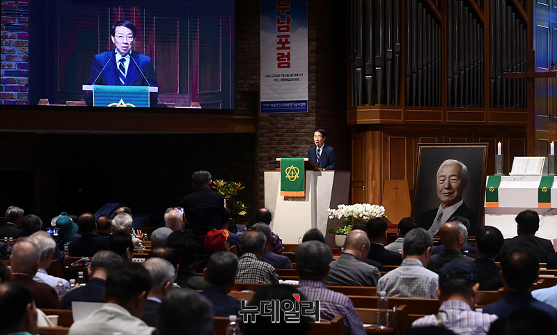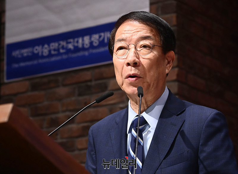 40대 국무총리를 지낸 정운찬 이승만대통령 기념재단 상임고문대표가 5일 오후 서울 중구 정동교회에서 '이승만과 대한민국'을 주제로 열린 한미우남포럼에서 축사를 하고 있다.이날 1부 행사는 최재형 트러스트포럼 대표의 개회선언을 시작으로 김남수 이승만건국대통령기념사업회 회장이 대회사를, 김영기 조지워싱턴대 명예교수, 데이빗 필즈 위스콘신대 교수, 오영섭 독립기념관 이사, 이택선 명지대 교수, 원성웅 목사가 발표에 나섰다.이어진 2부 행사는 김황식 이승만대통령 기념재단 이사장, 정운찬 상임고문대표, 김충환 해공신익희선생기념사업회 회장, 원로 연기자 최불암이 각각 축사했다.