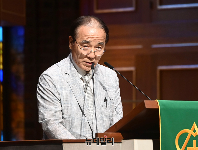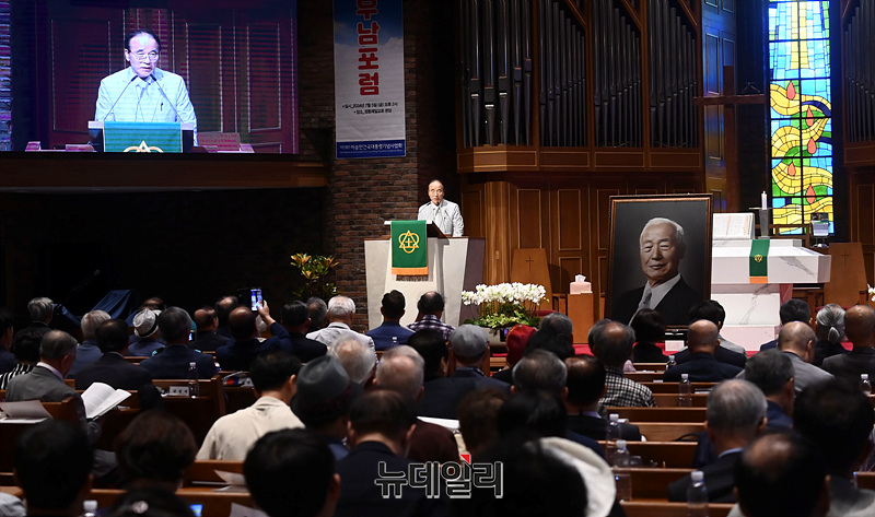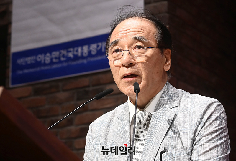 김충환 해공신익희선생기념사업회 회장이 5일 오후 서울 중구 정동교회에서 '이승만과 대한민국'을 주제로 열린 한미우남포럼에서 축사를 하고 있다.이날 1부 행사는 최재형 트러스트포럼 대표의 개회선언을 시작으로 김남수 이승만건국대통령기념사업회 회장이 대회사를, 김영기 조지워싱턴대 명예교수, 데이빗 필즈 위스콘신대 교수, 오영섭 독립기념관 이사, 이택선 명지대 교수, 원성웅 목사가 발표에 나섰다.이어진 2부 행사는 김황식 이승만대통령 기념재단 이사장, 정운찬 상임고문대표, 김충환 해공신익희선생기념사업회 회장, 원로 연기자 최불암이 각각 축사했다.