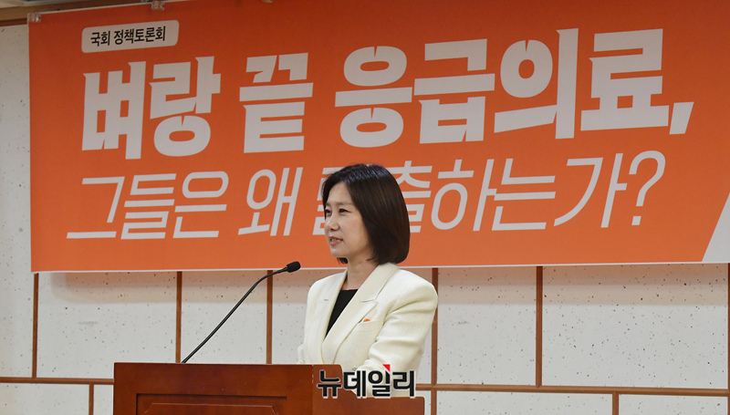 허은아 개혁신당 대표가 8일 오후 국회 의원회관에서 이주영 의원실 주최로 열린 '벼랑 끝 응급의료, 그들은 왜 탈출하는가' 정책토론회에서 축사를 하고 있다.