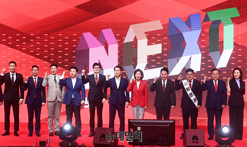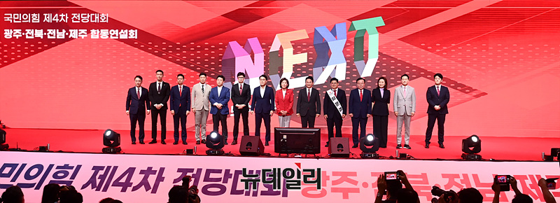 한동훈, 윤상현 나경원, 원희룡 국민의힘 당 대표 후보와 청년최고위원 후보, 최고위원 후보가 8일 오후 광주 서구 김대중컨벤션센터에서 열린 '제4차 전당대회 광주·전북·전남·제주 합동 연설회'에서 기념촬영을 하고 있다. (광주=서성진 기자)