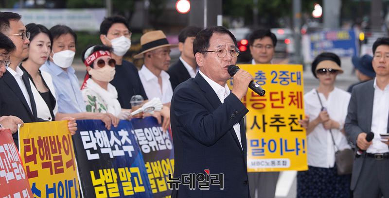 이들은 "탄핵소추 남발말고 방통위원 추천하라" "민주당 방송장악법 분쇄하자" "민노총 영구방송 장악법 결사반대" "방송개악 결사반대" 등의 문구가 적힌 피켓을 들고 '민주당 방송3법 강행'을 규탄하고 'MBC 정상화'를 촉구했다.