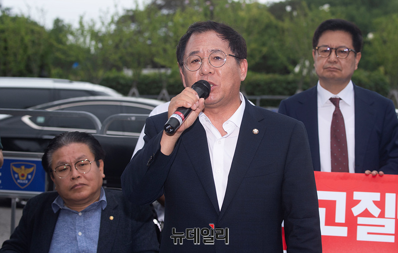 이상휘 국민의힘 미디어특위 위원장이 9일 오전 서울 여의도 국회 정문 앞에서 열린 '방송악법 저지 및 MBC정상화를 위한 공동투쟁위원회 기자회견'에서 발언하고 있다.